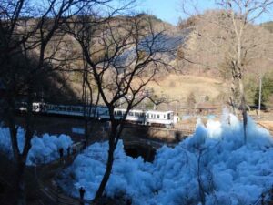 氷柱と電車のコラボレーションはあしがくぼならではの景色です。
